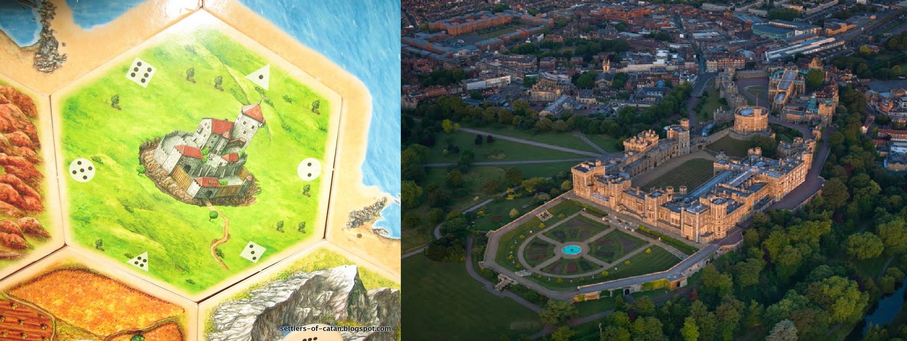 The world of Catan is no stranger to nobility. In fact, Catan is full of knights in shining armor, powerful lords, just rulers, and everyone in between. Where does all of this nobility live? Why, in castles, of course! Just look at the similarities between Catan's castle and Windsor Castle: