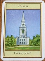 The base game of Catan has a development card called "Chapel." This valuable card is worth a victory point. If you happen to purchase this card, the Chapel may give you just enough victory points to win the game. Over the years, the Chapel has gone through a number of different design changes, as you can see below: